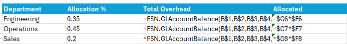 =FSN.GLAccountBalance($B$2, $B$3, $B$4, $B$5, $A10) * 0.35You’ve embedded the allocation calculation directly with the data retrieval. Now the drill-down is broken—you can’t right-click to investigate what makes up that overhead number. So when allocation percentages change next quarter, you’re hunting through formulas instead of updating a single cell.