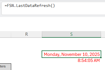 Use the FSN.LastDateRefresh() function to return a date/time result that you can format as a date or time.