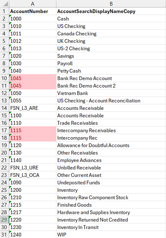 One often overlooked use of conditional formatting is identifying duplicates. This is especially helpful when reviewing account lists, mappings, or exported GL detail tied to NetSuite Financials.