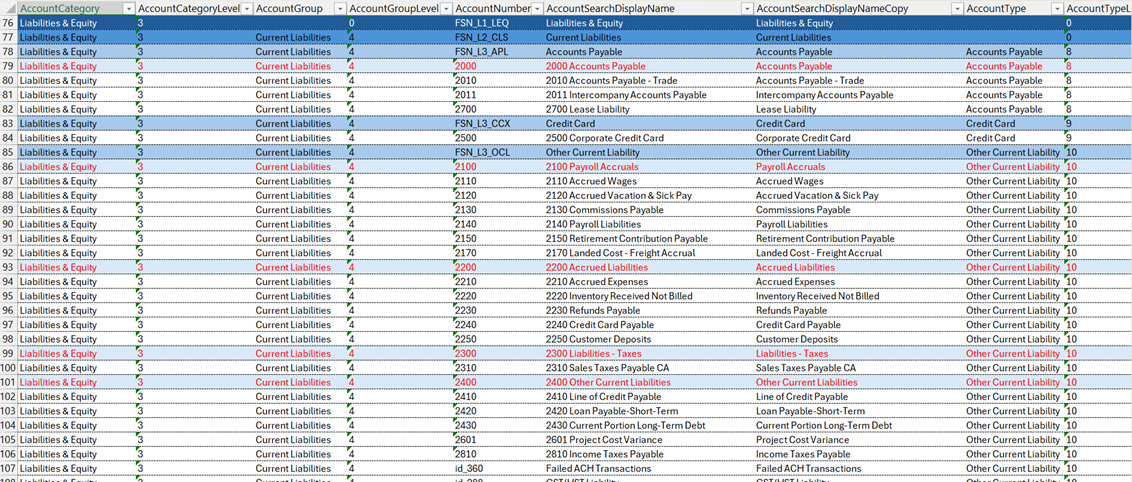 Excel provides full control over formatting, but Finsyte adds another layer by applying conditional formatting automatically to the generated lists. This formatting makes it easy to understand hierarchies that exist. The General Ledger (GL) List in particular also focuses on structural issues that commonly lead to reporting and reconciliation problems.